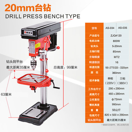 雅赛崎工业级台钻220V家用小型钻床380V大功率精密多功能电钻三相 20mm台钻 AK-034 035