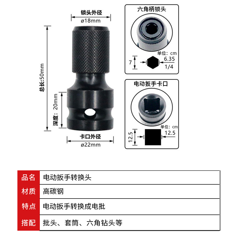 1/2四方柄转1/4六角柄电动扳手转换接头 伸缩弹套电动扳手转换头