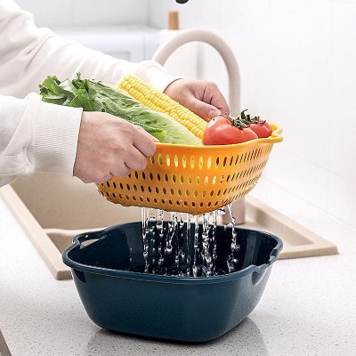新款厨房拼色双层沥水篮 菜篮 家用方形多功能水果蔬菜盆大号