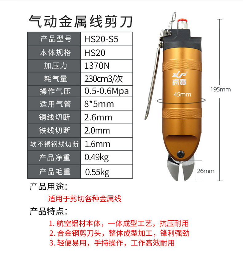 高宝HS20-S5气动剪刀铜线铁线气剪斜口金属线气动剪钳跨境专供