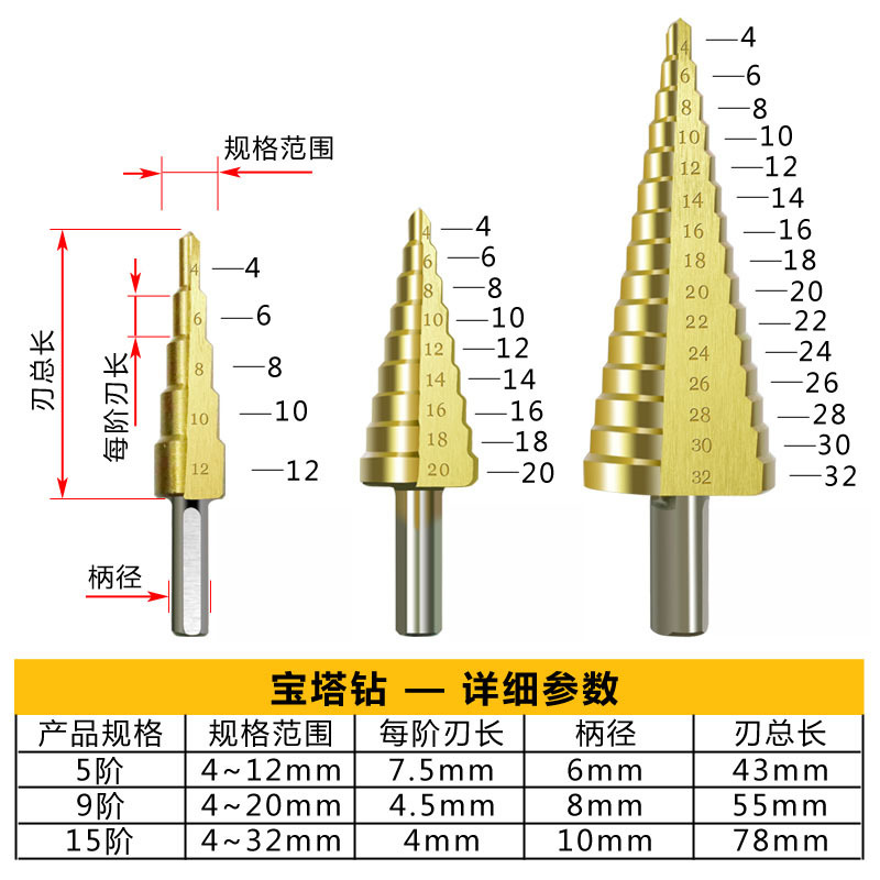 直槽螺旋槽阶梯钻 三角柄台阶钻头 高速钢M35含钴 镀钛 宝塔钻 套装