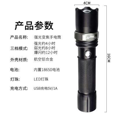 Factory direct sale aluminum alloy zoom light flashlight LED rechargeable outdoor riding gift custom USB flashlight