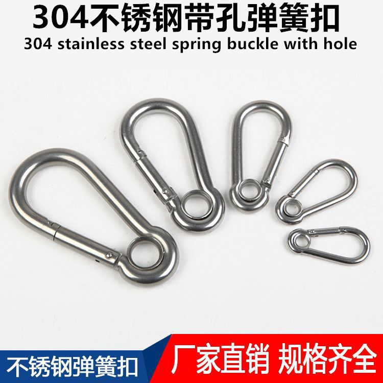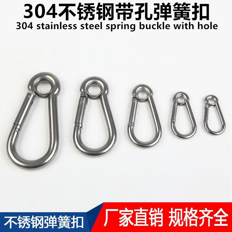 Wholesale 304 stainless steel spring buckle with holes. Buckles. Wire rope accessories. Outdoor climbing spring buckle with lock, safety buckle, key chain 4 * 40 5 * 50 6 * 60 7 * 70 8 * 80