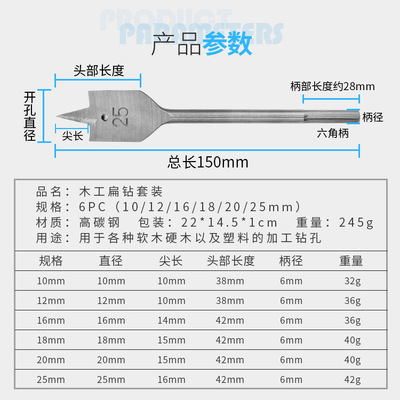 Woodworking flat drill three-point drill bit woodworking drill bit woodworking hole puncher set hexagon shank bit wood drilling tool 10-25mm drill bit