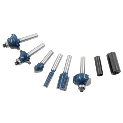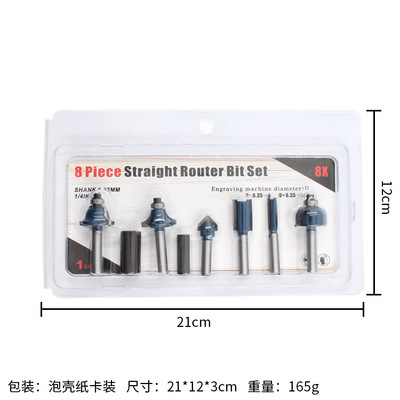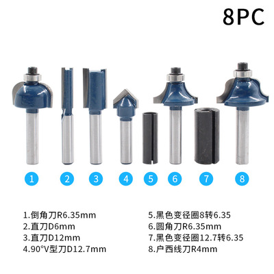 Woodworking milling cutter 8PC set 1/4 shank straight cutter rounded corner cutter V-shaped cutter Trimming machine cutter head Variable diameter ring combination milling cutter Woodworking milling cutter