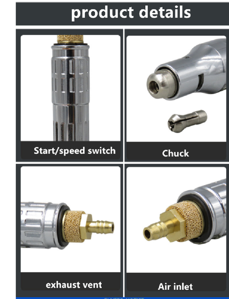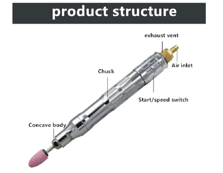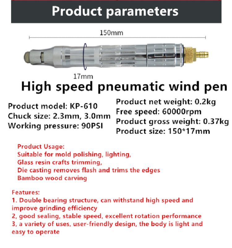 No-load speed 60000 (rpm) Working pressure 0.5-0.6Mpa Air inlet size 1/4 (inch)