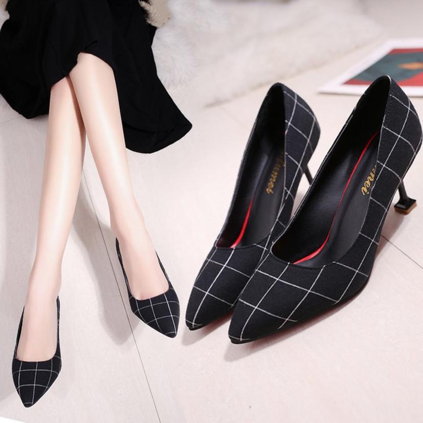 2018 new plaid single shoes stiletto shallow mouth high heels Korean fashion comfortable wild student shoes tide i061 (shoes 132)