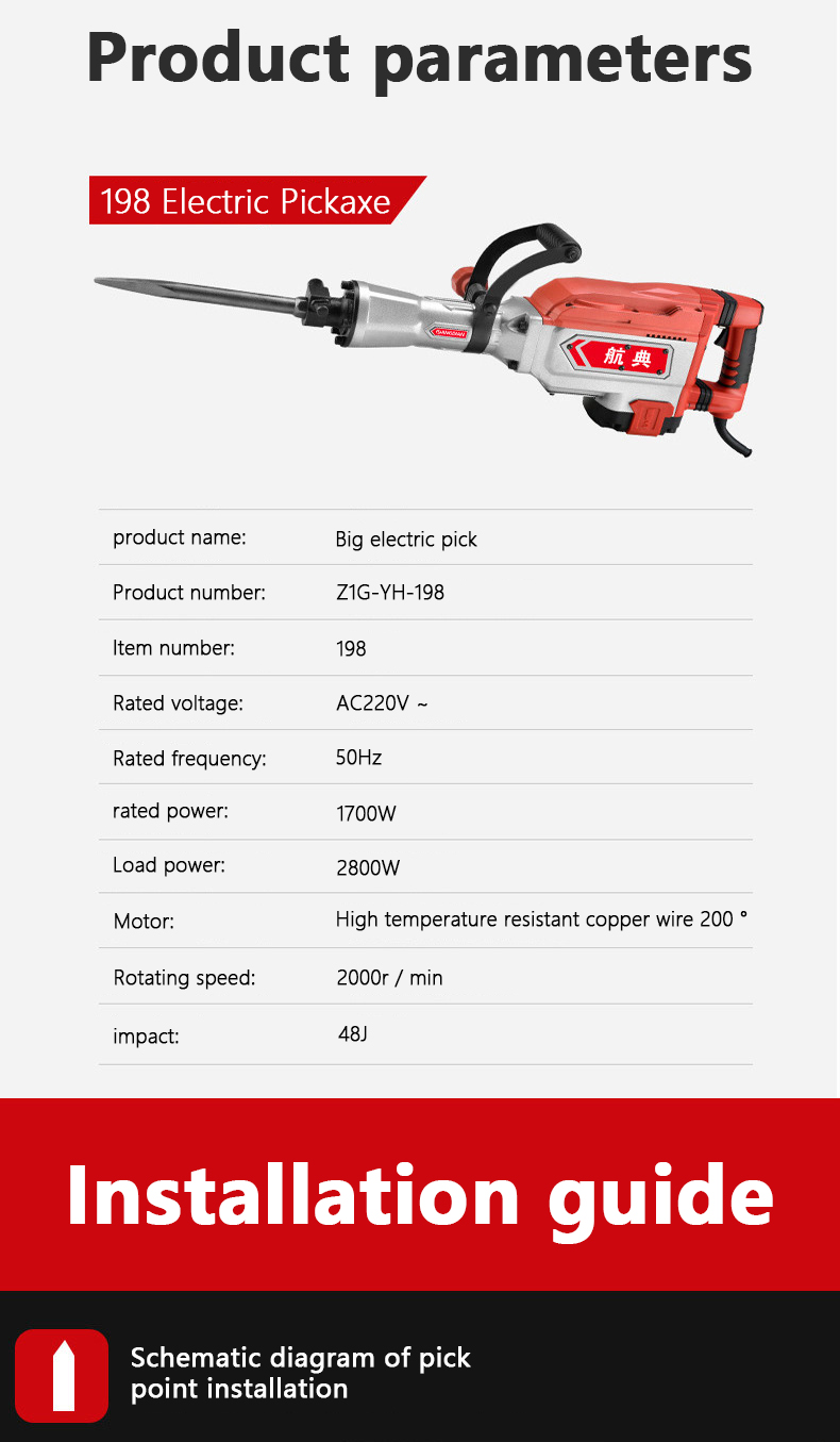 Brand Hang Code Item No. Z1G-YH-198 Model Z1G-YH-198 Heavy-duty Electric Pickaxe