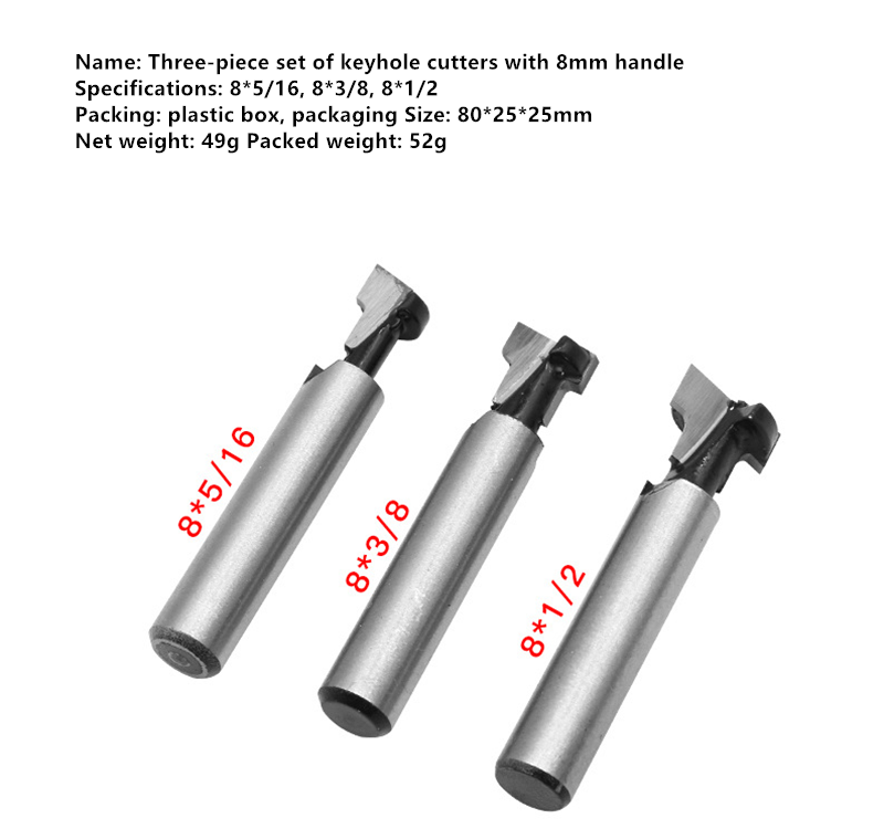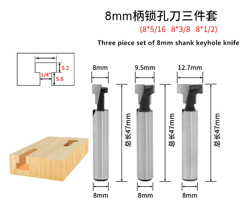 Woodworking milling cutter 8mm shank keyhole cutter T-shaped keyhole wood hanging wall frame opening three-piece 5/16 3/8 1/2 hole opener woodworking milling cutter